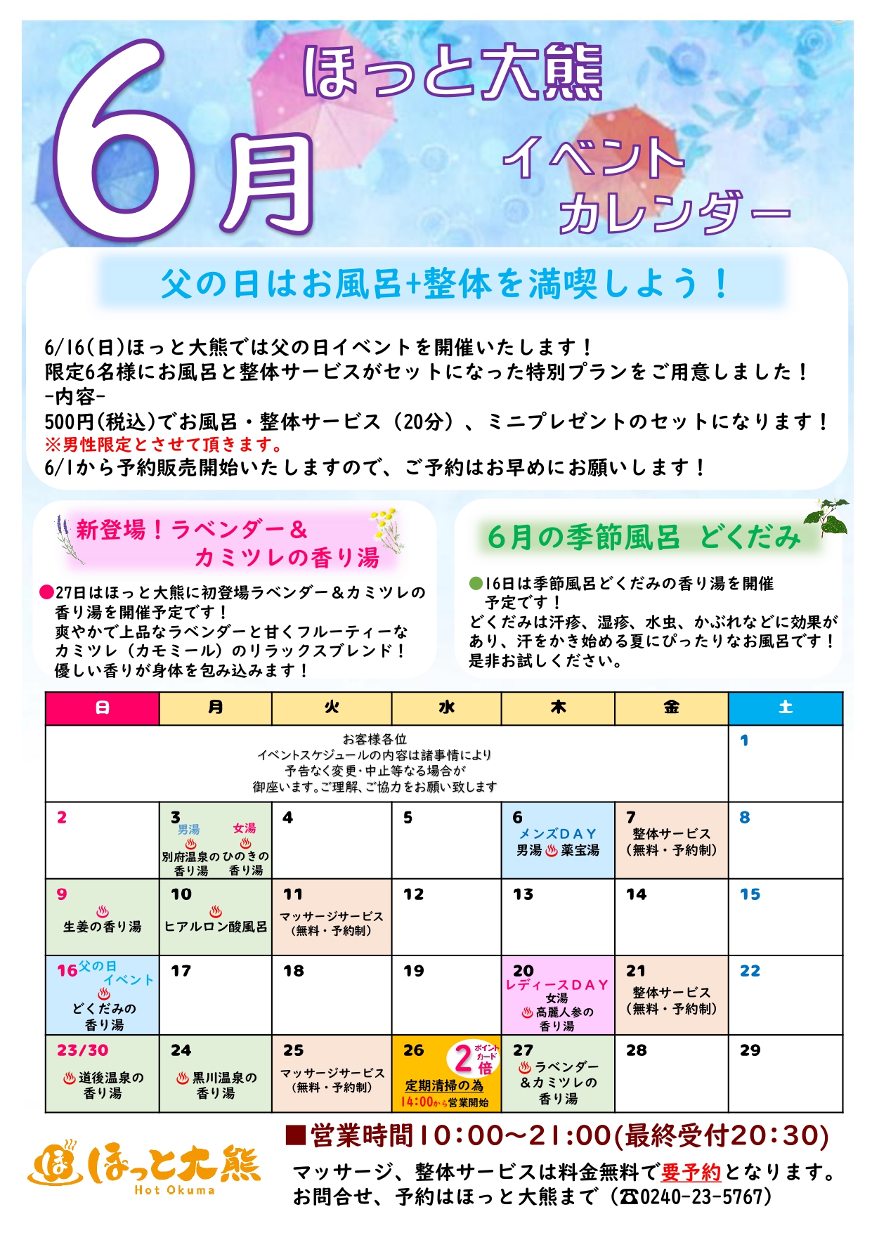 いつもご利用ありがとうございます。ほっと大熊6月のイベントカレンダーです!