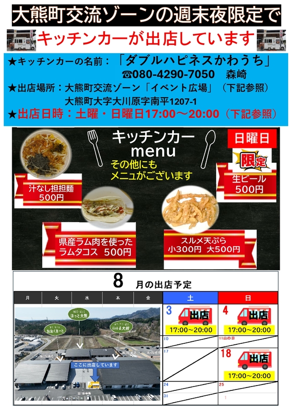 日時:8月3日(土)、4日(日)、18日(日) いつれも17:00~20:00 場所:交流ゾーンイベント広場(第1駐車場側) 出展者:ダブルハピネスかわうち ☎080-4290-7050 森崎 メニュー:下記のチラシをご参照下さい。