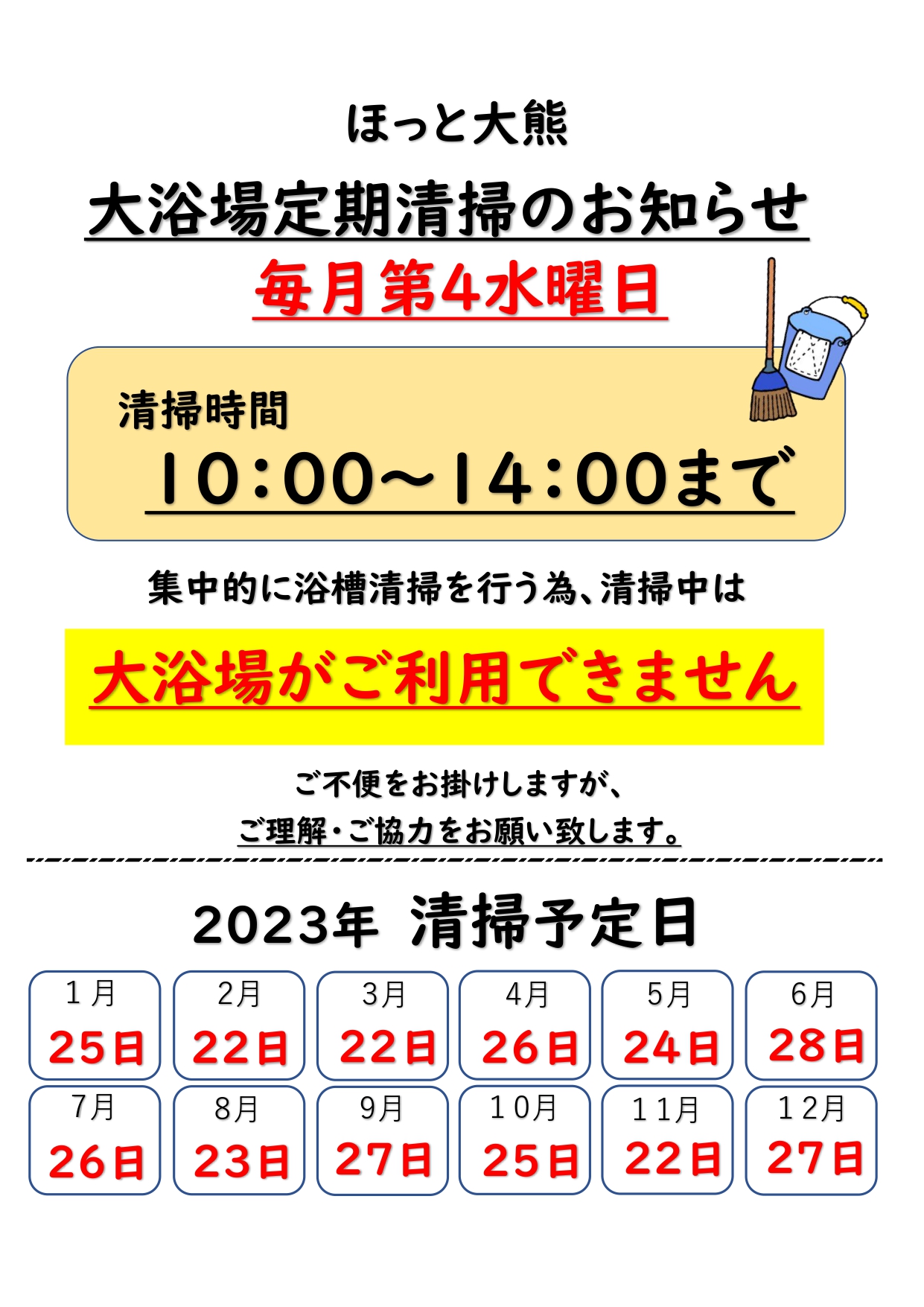 정기 청소는 매월 제4 수요일을 예정하고 있으므로, 자세한 것은 POP를 봐 주세요.